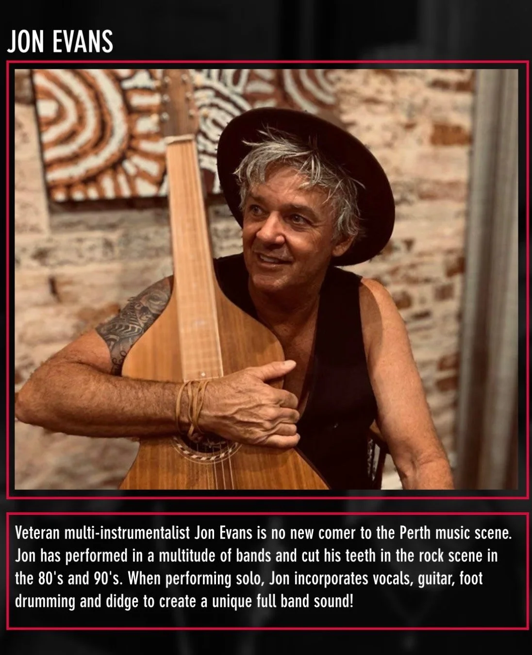Jon is no new comer to the Perth music scene. Jon has performed in a multitude of bands and cut his teeth in the rock scene in the 80’s and 90’s. When performing solo, Jon incorporates vocals, guitar, foot drumming and didge to create a unique full band sound.